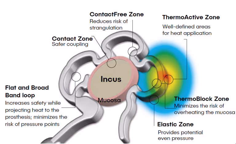 The nitinol loop has four integrated contact zones, conforming to the asymmetrical dimensions of the incus. Additionally, the loop also features three independent activation zones that help prevent thermal transfer to the incus mucosa during laser activation. These activation zones can be sequentially closed producing a custom coupling to the incus.