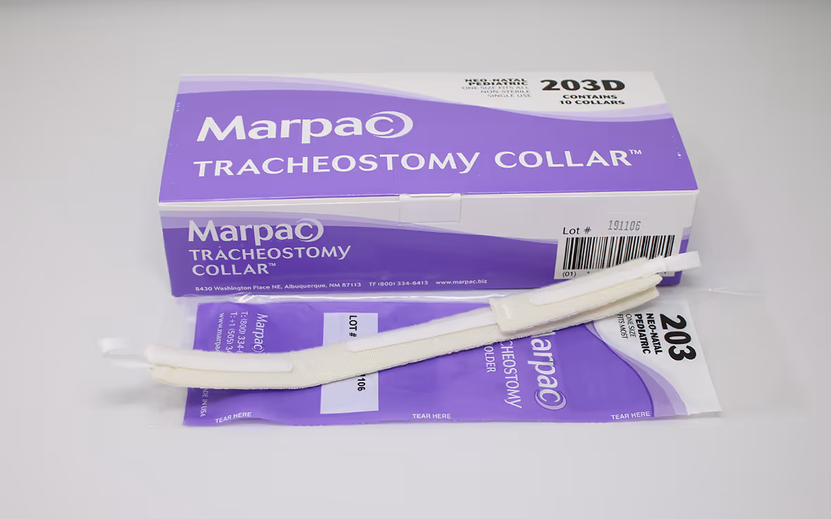 The 203 is an adjustable neonatal & paediatric tracheostomy collar with a unique twill/velcro hybrid ties. Designed to provide security and comfort for both care providers and patients alike. Adjustable to fit 6-12″ necks. Secured with velcro – but with twill sitting in the eyelets.